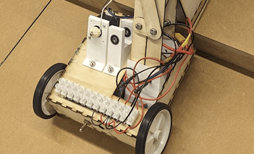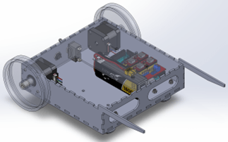 The chassis was to provide a sturdy platform to mount the other subsystems and provide movement across the surface of the competition track. The design and manufacture of this subsystem was my responsibility. Over three prototype iterations, I delivered the following chassis made from finger jointed laser cut plywood sheets.