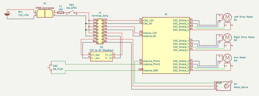 A component selection process lead to the procurement of a 11.1V LiPo battery (to comply with lab safety guidelines), and an Arduino Mega paired with a A4988 shield (due to a suitability for driving stepper and servo motors and ready availability) as the basis for power and control respectively. These components were then integrated with the various actuators on the other subsystems.
